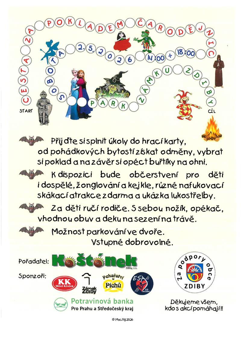 I letos pro Vás Kaštánek připravil na sobotu 2.6.2026 zajímavý program. Přijďte do parku Zámku Zdiby splnit úkoly do hrací karty, od pohádkových bytostí získat odměny, vybrat si poklad, a na závěr opéct buřty.